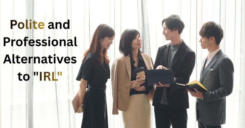 Casual internal messages with coworkers allow IRL safely. Startup culture and digital-first companies accept internet acronyms more readily. However, job applications, client proposals, legal documents, and executive emails demand elevated alternatives like “in person” or “physical meeting” instead.